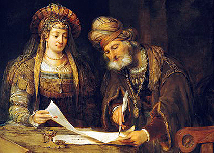 Esther und Mordechai schreiben den ersten Purimbrief, Gemälde des niederländischen Malers Aert de Gelder (1675); Quelle: Wikipedia